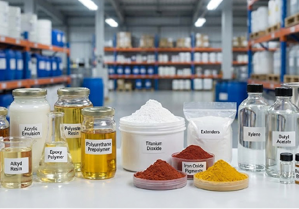 Resins (alkyd, acrylic, epoxy, polyester, polyurethane, alkyd emulsions), pigments & fillers (titanium dioxide, iron oxides, extenders), solvents, monomers, and key building blocks.