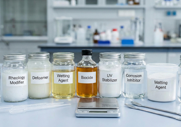 Dispersing agents, rheology modifiers, defoamers, wetting agents, biocides, UV stabilizers, corrosion inhibitor